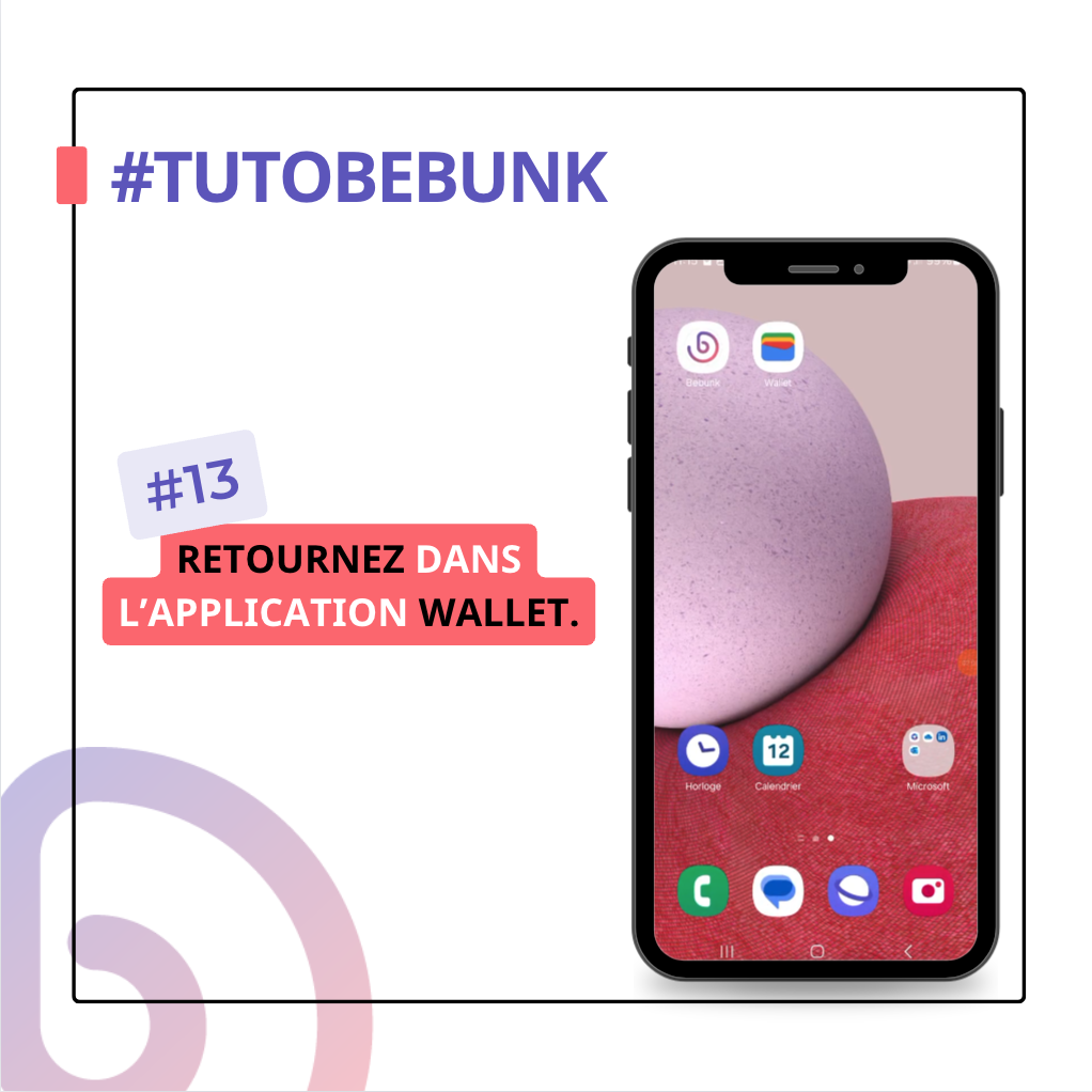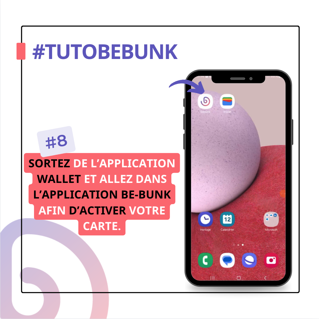 Après avoir activé votre carte sur votre appareil mobile et saisi votre code d’authentification, vous devez quitter l’application Be-bunk et ouvrir l’application Wallet à nouveau.