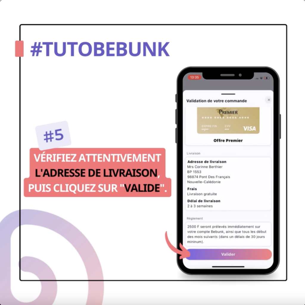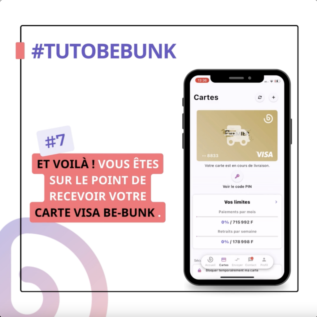 Et voilà ! Vous avez maintenant suivi toutes les étapes nécessaires pour recevoir rapidement votre carte Visa Be-bunk. Elle arrivera dans votre boite au lettre dans un délais de 3 semaines*. Profitez de ses nombreux avantages et commencez à simplifier vos transactions financières au quotidien.